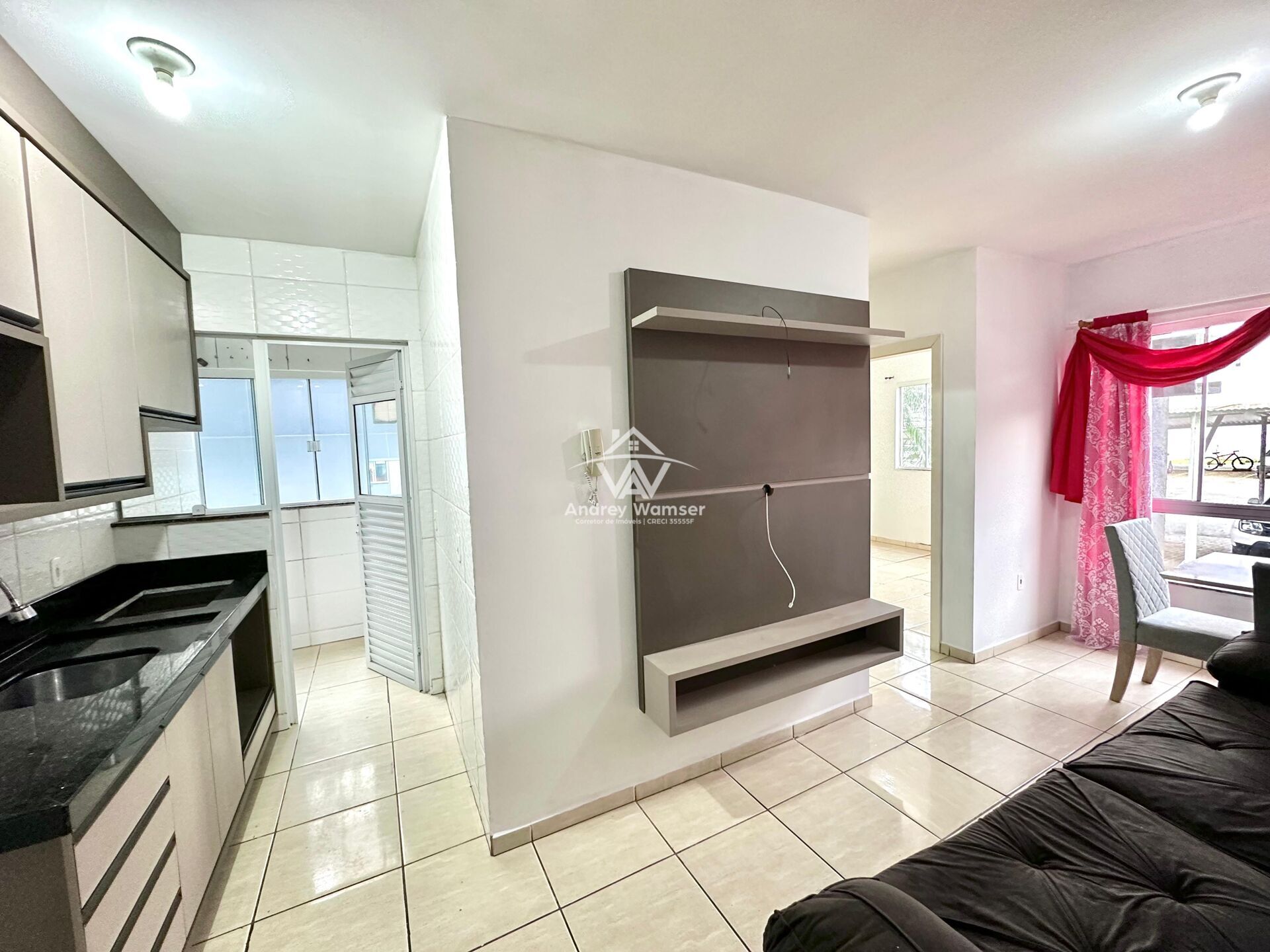 2 dormitórios (sendo 1 suíte), ambiente integrado sala de estar/jantar e cozinha, área de serviços, banheiro e 1 vaga de garagem coberta.