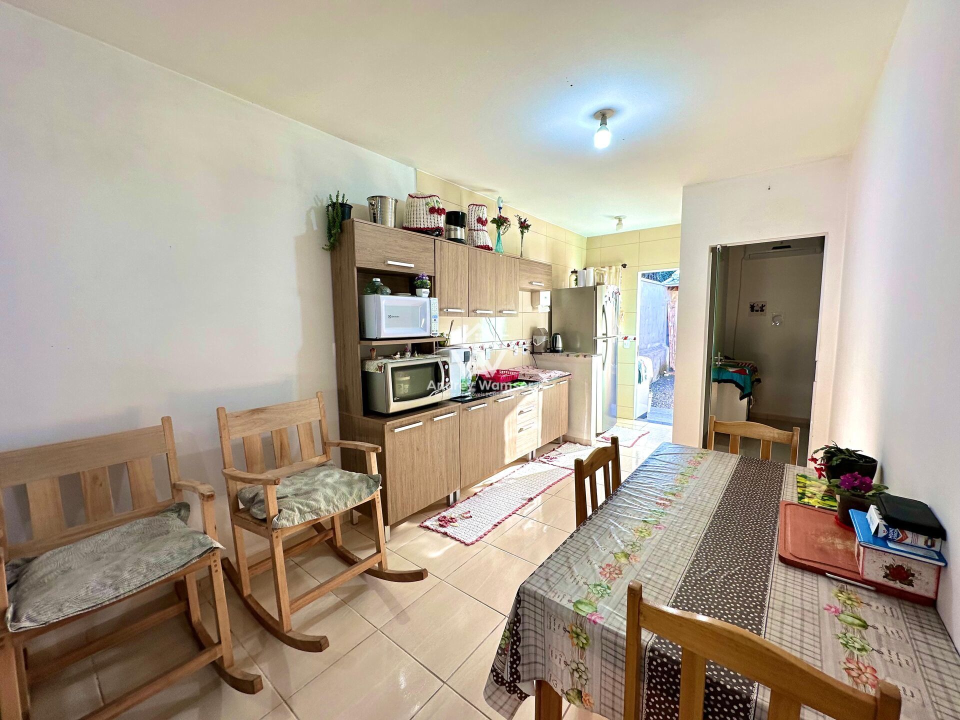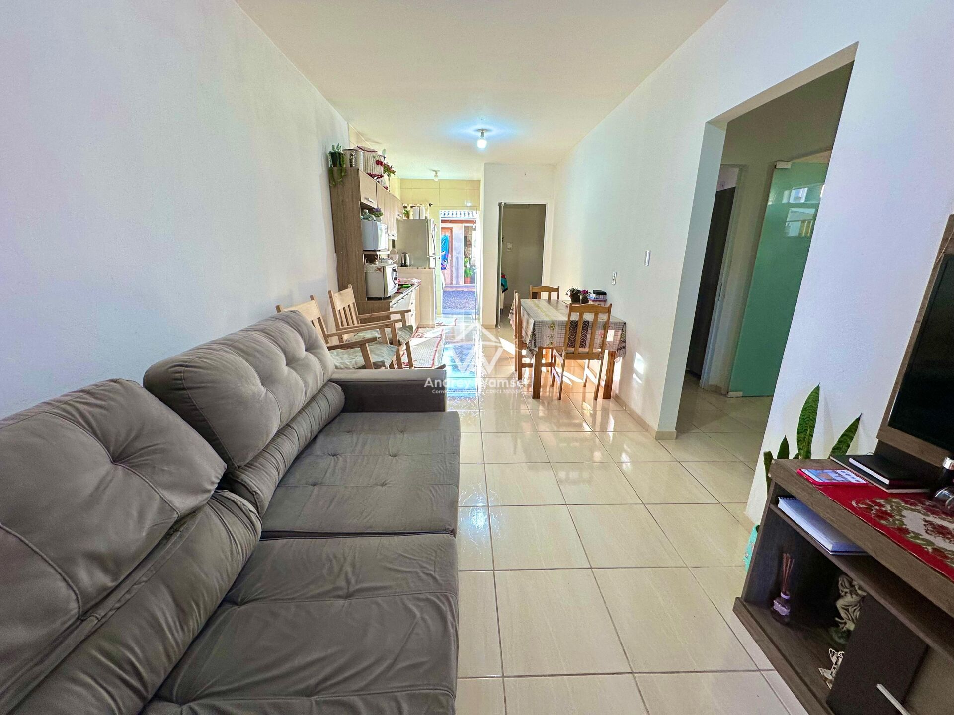 3 dormitórios, 2 banheiros, ambiente integrado sala de estar/jantar e cozinha, área de serviço e garagem com 2 vagas.