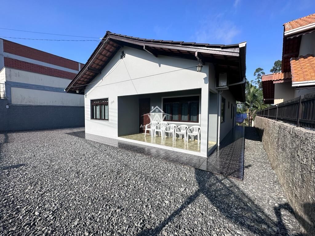 Este imóvel, localizado a 100 metros da R470, oferece uma posição privilegiada com proximidade de 300 metros da empresa Albany, 400 metros da empresa Taschibra, 600 metros da Havan e 1.800 metros do Mercado Unibox. A casa principal, com uma área de 150 m², conta com três quartos, sala de estar, cozinha, banheiro social, área de serviço, despensa e uma garagem com churrasqueira. A residência foi recentemente reformada, incluindo telhado, parte elétrica e pintura. Os ambientes internos foram renovados, apresentando piso laminado, piso retificado no banheiro e porcelanato na cozinha. O madeiramento de cambará e as portas e janelas de itaúba contribuem para a estética e durabilidade.