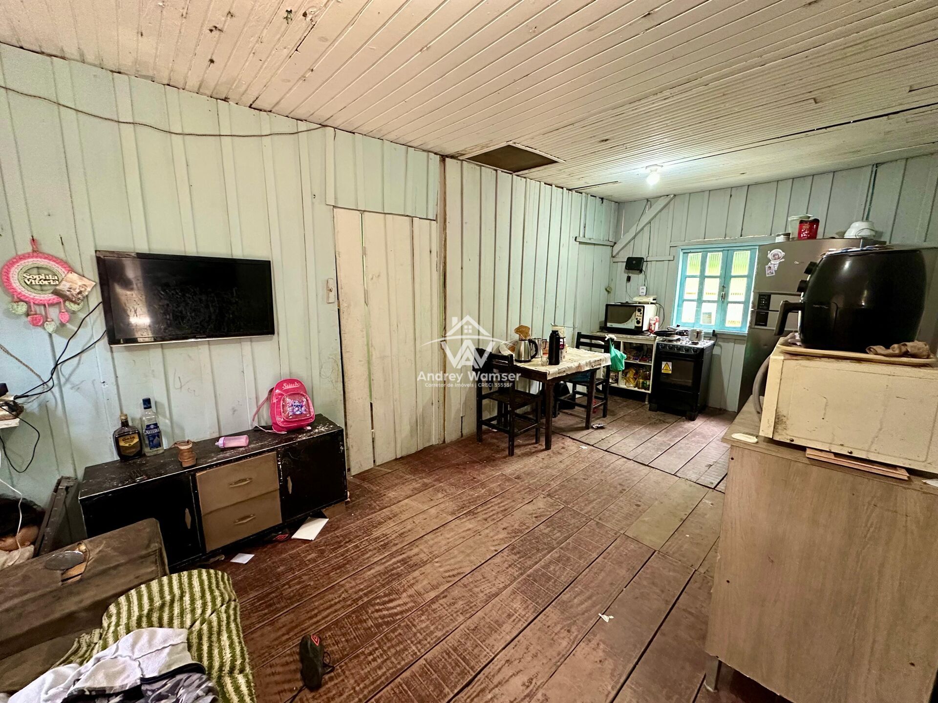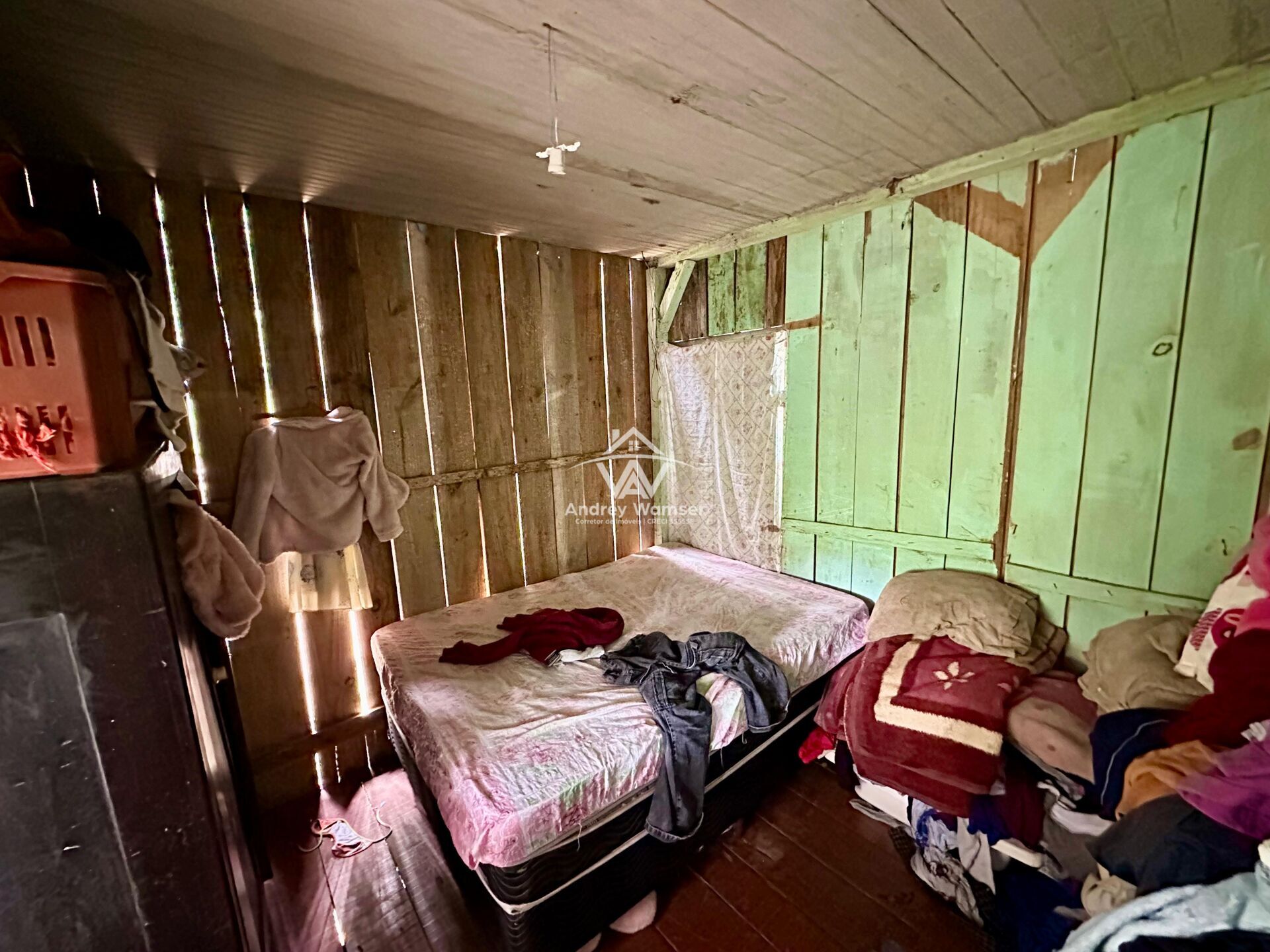 Casa de madeira composta de 2 dormitórios, sala, cozinha, banheiro e garagem.