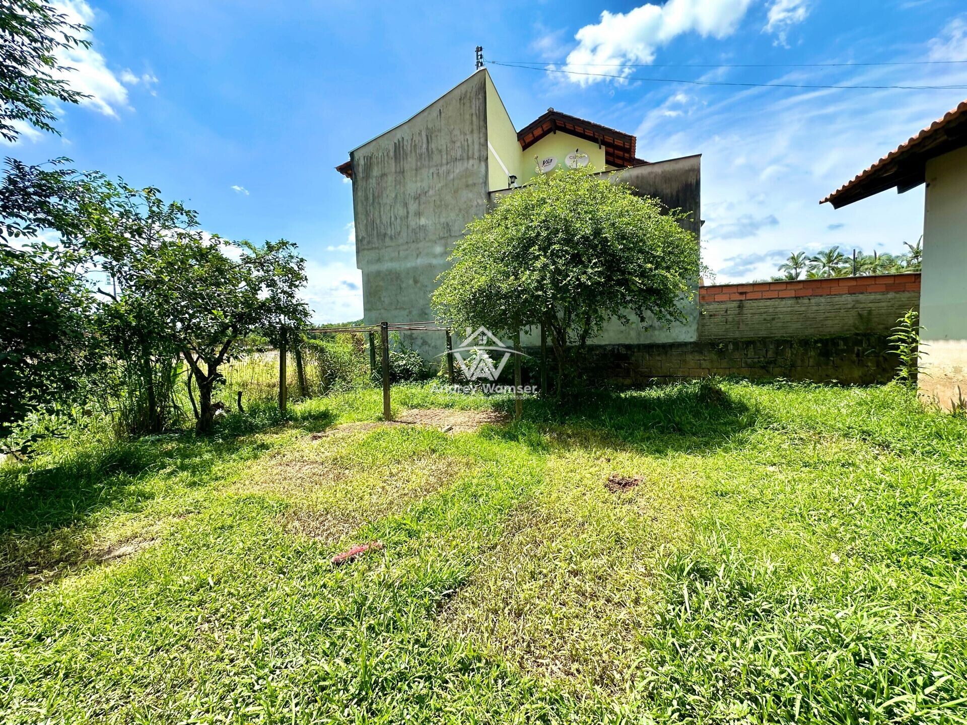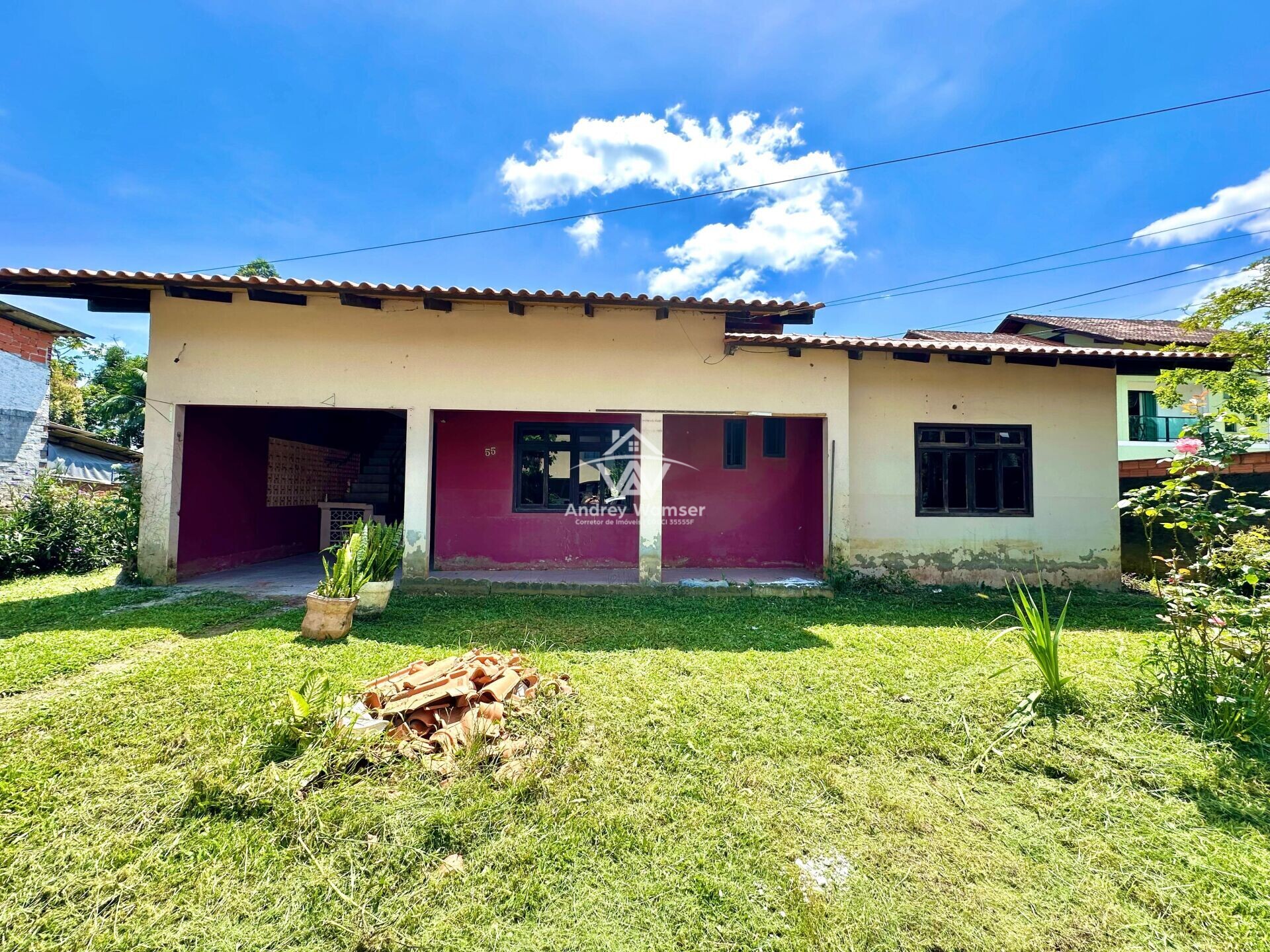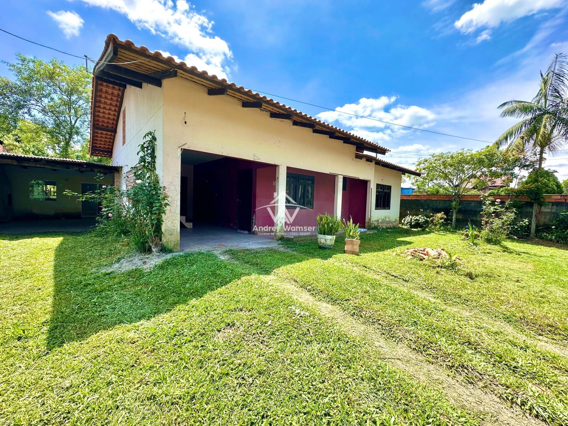 Amplo espaço de terreno na frente e nos fundos do imóvel.