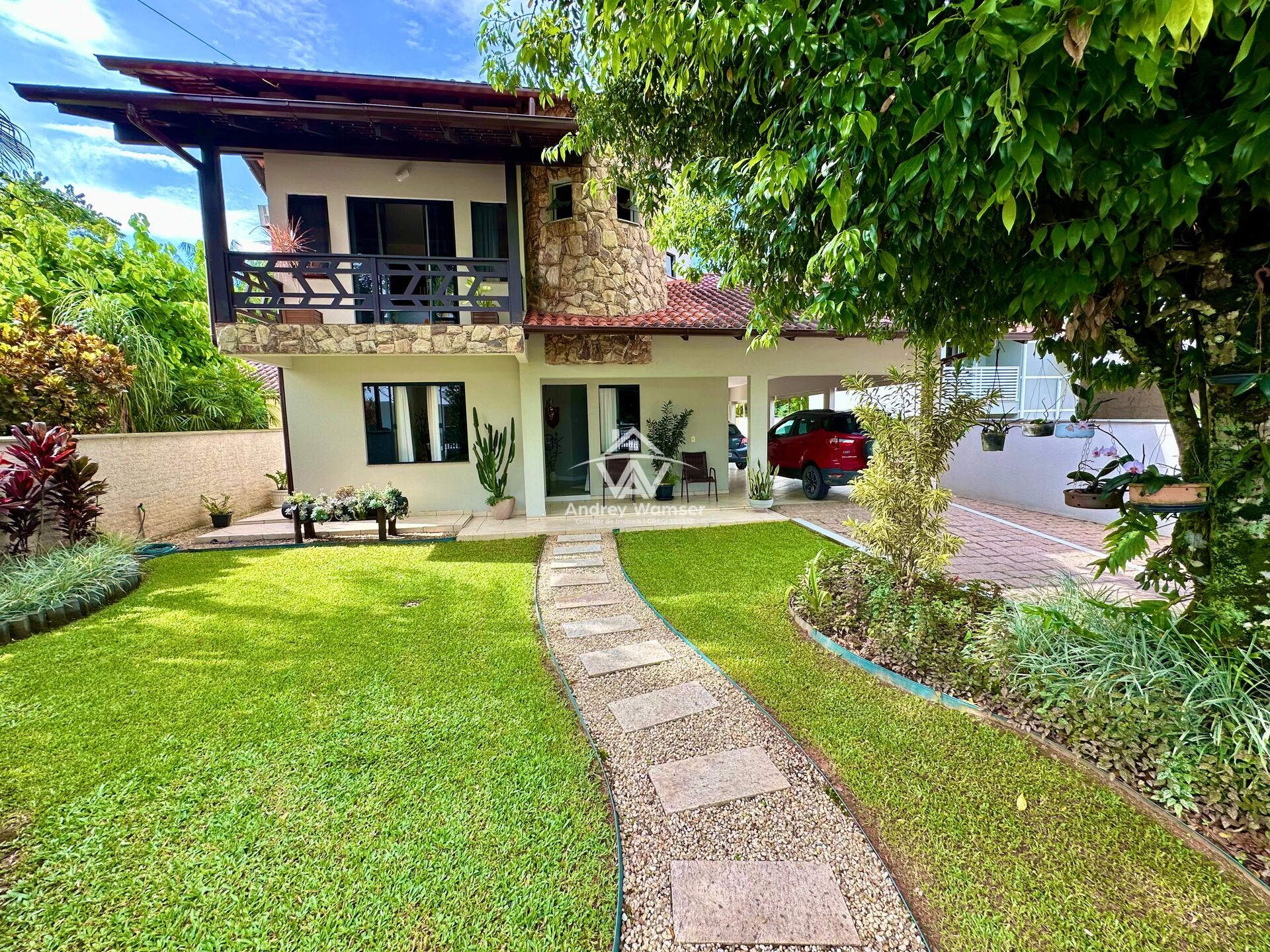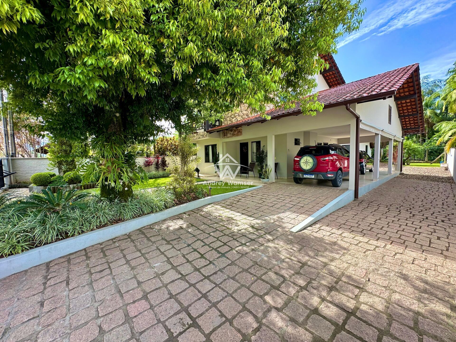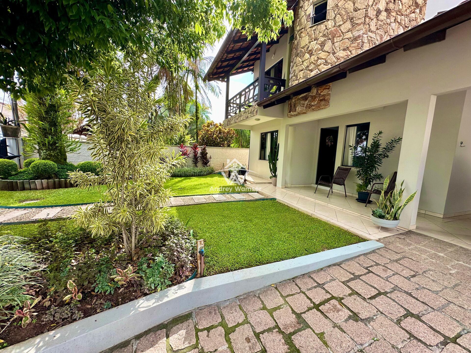 Terreno com lindo jardim, árvores e flores embelezando ainda mais o imóvel.