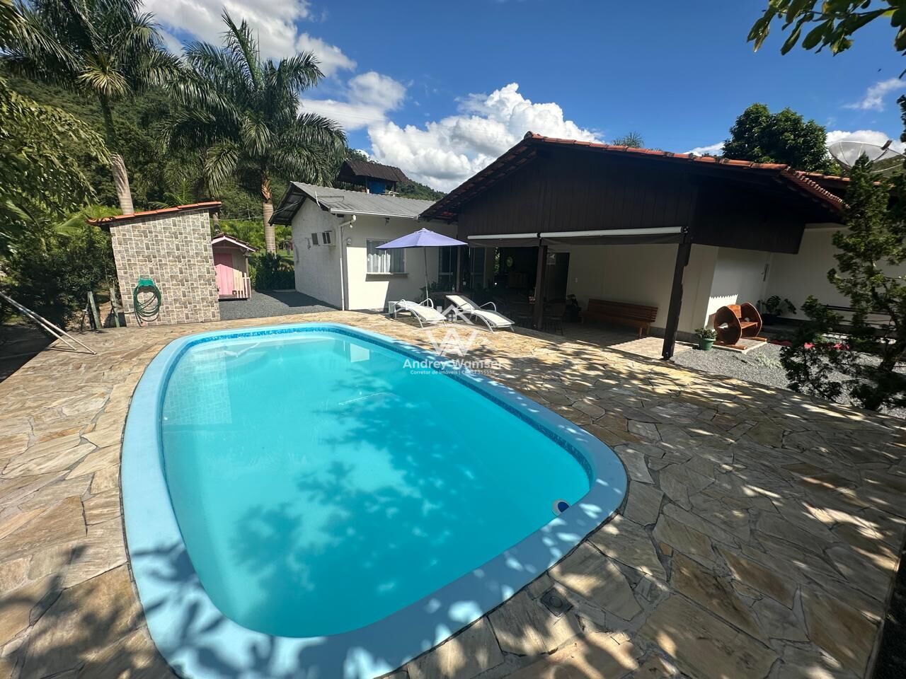 Além da casa , também possui uma ampla área de festa com piscina e garagem coberta.